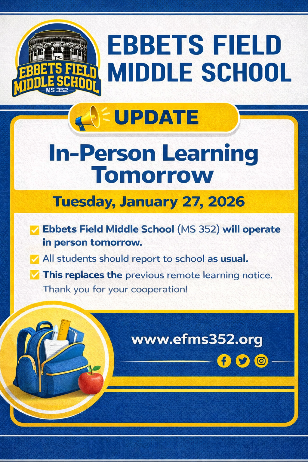 The mission of Ebbets Field Middle School is to empower our students to become lifelong learners by instilling determination, perseverance, and resilience. The aspirations and interests of every child will be developed to create successful readers, writers, speakers and critical thinkers; so they make a positive impact in society. We enlist the support of families and the community to help us realize this mission.